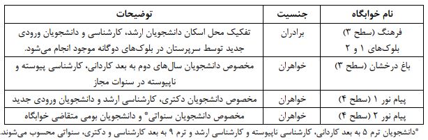3-بر اساس مصوبه شورای دانشجویی، تقسیم بندی خوابگاهها برای اسکان دانشجویان عزیز به شرح ذیل است: